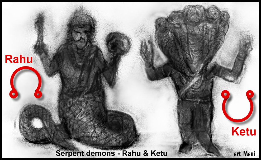 Rahu & Ketu are – according to Hindu mythologies – the serpent demons who swallow the Sun and Moon! This occurrence is of course a Solar Eclipse or a Lunar Eclipse (`Sooriya Grahanam’ and `Chandra Grahanam’ in Tamil language).