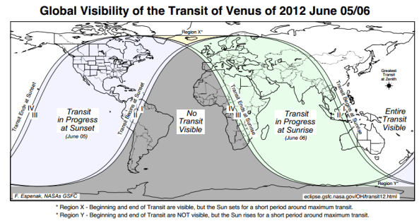 Anyway, when the transit of venus starts, it will be different times.. for different parts of the world (time zones). Here’s the thing- for some people, it will actually be middle of the night! That means they can’;t see the Sun (!), and if ya can;t see the Sun, you can’t see Venus going in front of the Sun. In the map attached, you can see the shaded parts of the world `No transit visible’. If you are in one of those counties, or parts of those countries, alas, you are having night time.. so you won;t see it. (parts of South America, parts of Africa). For everyone else, the transit of venus is visible.. at least the beginning, middle, or end of the transit.