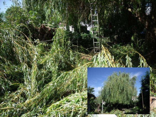 And recently, due to some neighborhood wrangles, I have had to do some very very drastic cutting, trimming and pruning of the Willow. It was a traumatic time for the tree, and me. Huge limbs have been hacked away by me and my newly bought electric chain saw. Afterwards, I could not face the tree for weeks. I left the fallen limbs as they were. And I guess I was in a state of trauma and transition too.