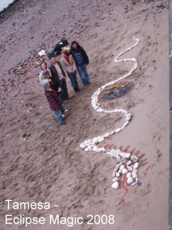 Here is a photo of the actual large `snake’ members of the Tamesa ritual team created on the banks of the river Thames for a special Eclipse Ritual back in 2008 (near central London). We used a variety of stones, pebbles, bones, old bricks, tiles and such that were found on the shores to create this colourful physical sculpture. Following that, we did a magical ritual and then simply left the image on the shores, just as the Thames tide was coming back up. The idea was that as the tide came and washed away the magical design, it would also take into itself the `thought-form’ and energies we had laid on it, and sweep the energies to the Sea!
