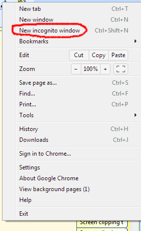 2. A small `dialogue’ box (with options) will open up on the right hand side.. It will look a bit like this. The 3rd line in it will say something like `New incognito window’. Select that. A new browsing window will open up. (The previous one will also be open. Make sure you go into the previous one and close that!)