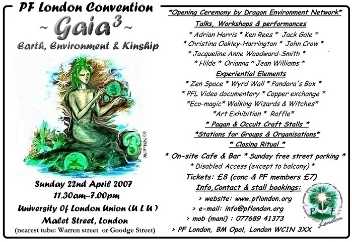 When the Pagan Federation discontinued its National Conferences after the one of 2004, many wondered what will happen. Many of the districts of the PF began to hold local district conferences. Following suit, PF London also held its district conference in 2007. Instead of calling it just a district conference, I took the initiative (as the then PFL Event Manager) and gave it a name and an identity – `Gaia3 convention’ and a tag-line, `Earth, Environment, Kinship’, for that’s what the Convention was all about! This was done to bring additional awareness to ecological matters, because I had observed, at the time, that pagans in London seem to talk a lot of honouring and worshiping the Earth and natural world, but didn’t seem to put the kind of emphasis on such ecological matters – that far less earth-centred companies or other non-pagan groups were doing. It was crazy that there had never been an Earth-themed conference of any sort – not at least in the previous 12-15 years (to my knowledge).