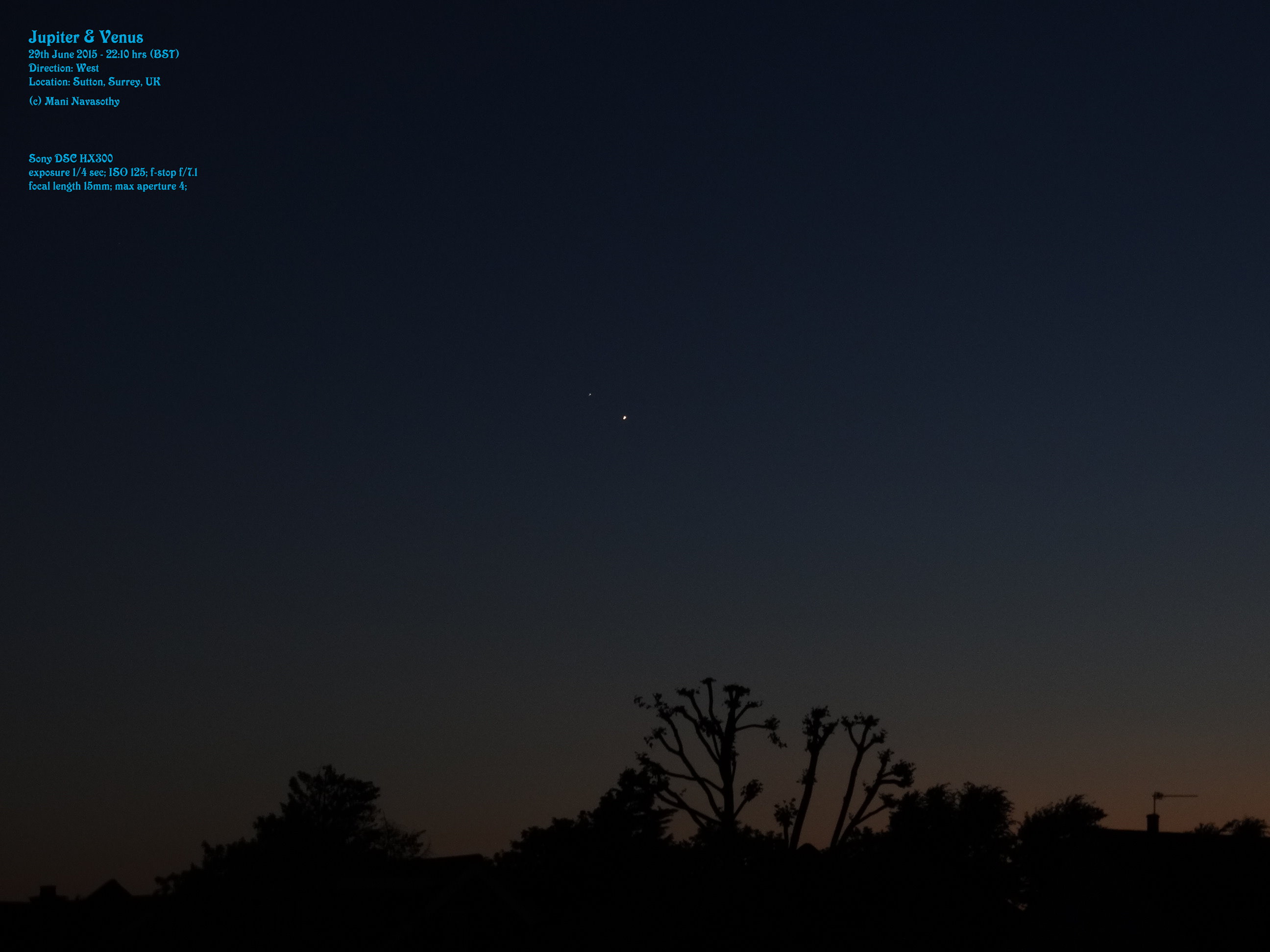 Some photos of the waxing Moon (taken last night on 28th June’15) and Jupiter almost conjunct Venus (taken this evening 29th June’15). I will try to take photos of the Jupiter-Venus conjunction over the next few days (wish us astro-photographers clear skies). 🙂 -Mani Navasothy