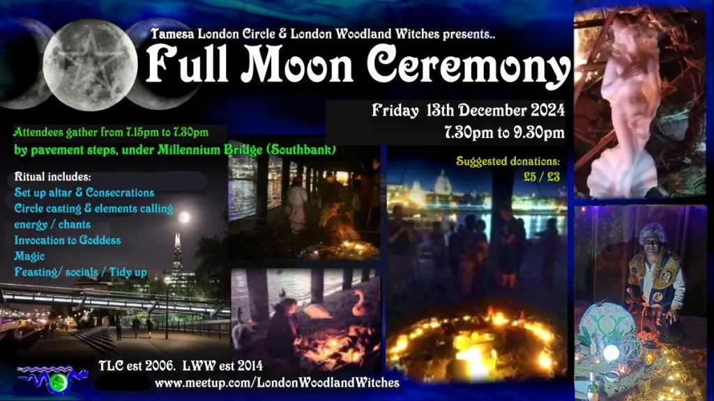 I facilitate Wicca-based Full moon ceremonies every month, in central London, near Millennium Bridge area – very close down to the river Thames shoreline. These are part of the `London Woodland Witches’ events. We are careful to check Port of London Authority’s website for when Thames tides are low.. when planning these Full moon rituals by the Thames.
